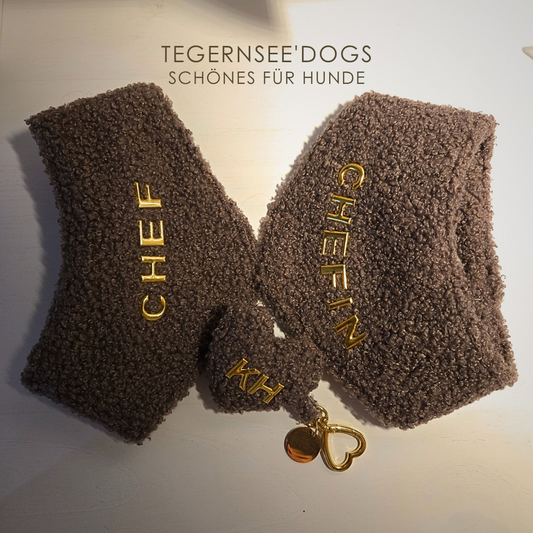 Kuschelweiches Halstuch aus hochwertigem Bouclé Stoff in Schokobraun mit goldfarbenen Buchstaben und praktischen Druckknöpfen zum problemlosen an- und ausziehen.