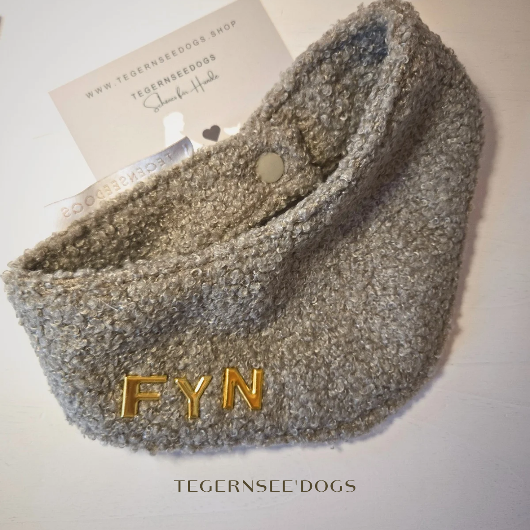 Sehr hochwertiges, dichtes Bouclé, das sich wie ein Schal perfekt an den Hundehals anschmiegt und die Form hält. Praktische Druckknöpfe zum Schließen sorgen für einen guten Sitz. Fyn trägt es in Größe M 33-36cm.