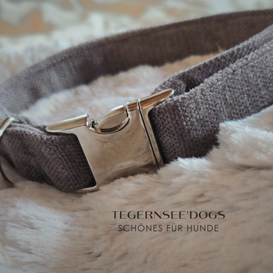 Praktisches und schlichtes Halsband in edlem Design. Der Chenille Samt ist schön griffig und robust. Der schöne Schimmer im Stoff macht dieses Stück zu einem edlen Alltagsbegleiter.